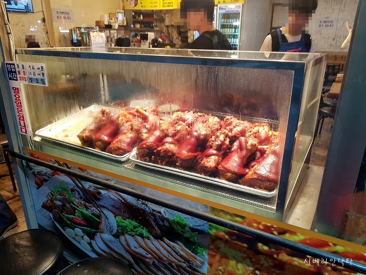 입구쪽에는 미리 삶아둔 족발들이 진열되어있다.