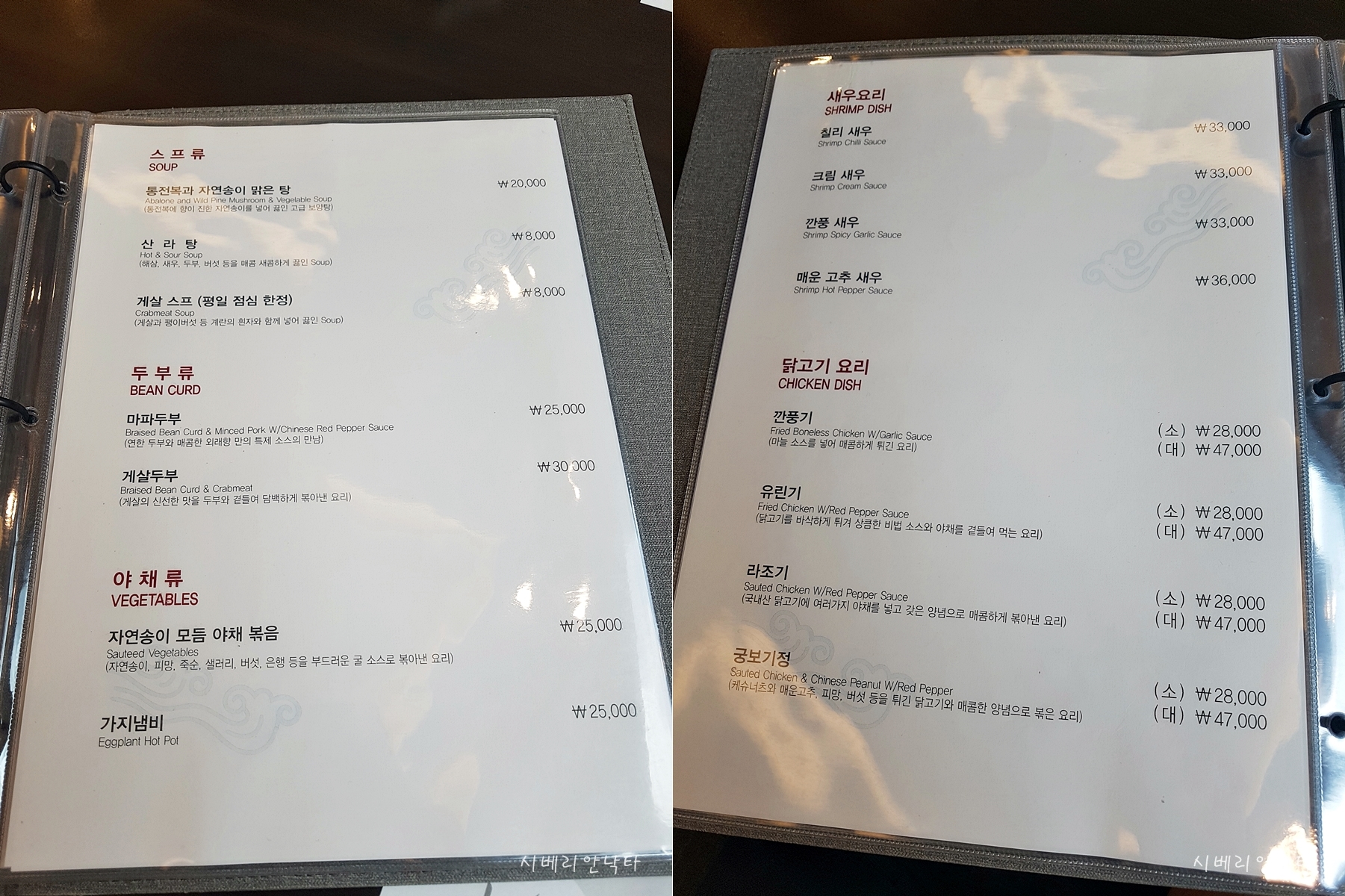 통전복자연송이맑은탕 : 2만원 / 산라탕, 게살스프 : 8000원