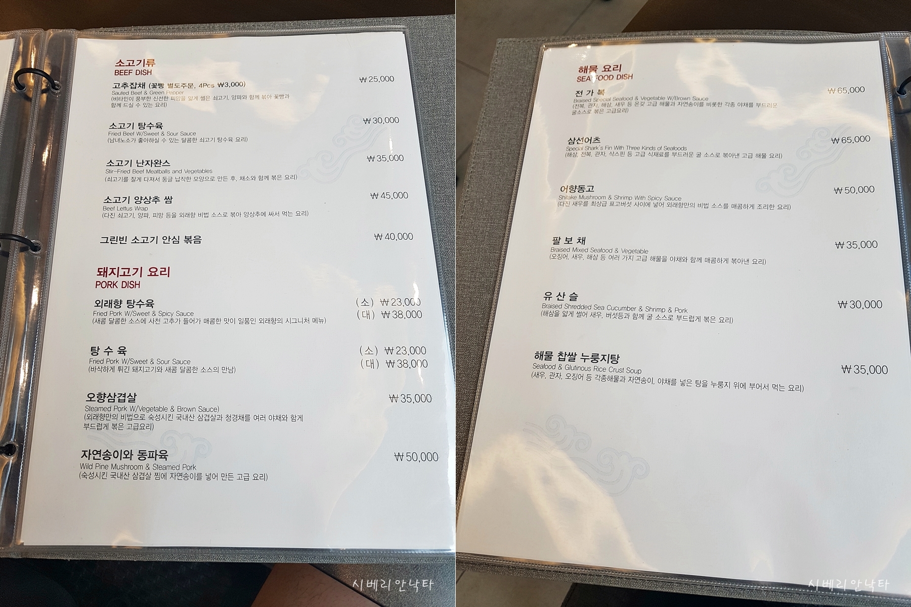 소고기탕수육, 유산슬, 양장피, 세가지냉채, 게살두부 : 3만원