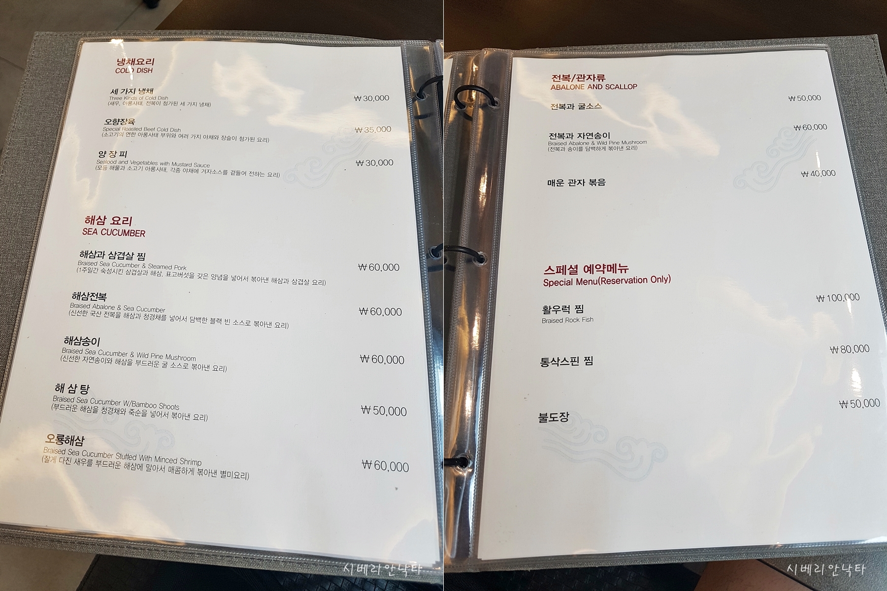 해삼전복, 오룡해삼, 해삼송이 : 6만원 / 전가복, 삼선어초 : 6.5만원