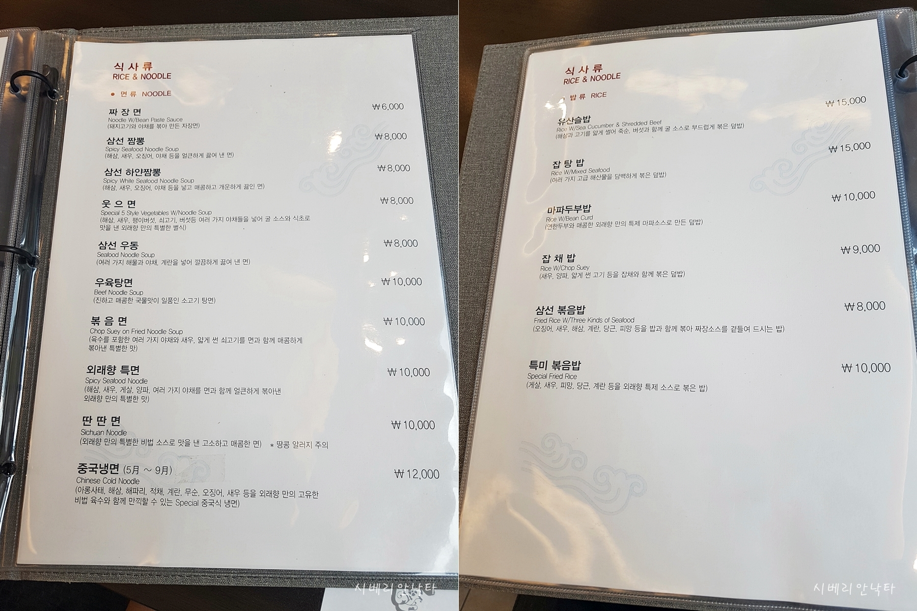 우육탕면, 볶음면, 외래향특면, 딴딴면 : 1만원 / 중국냉면(5~9月) : 1.2만원