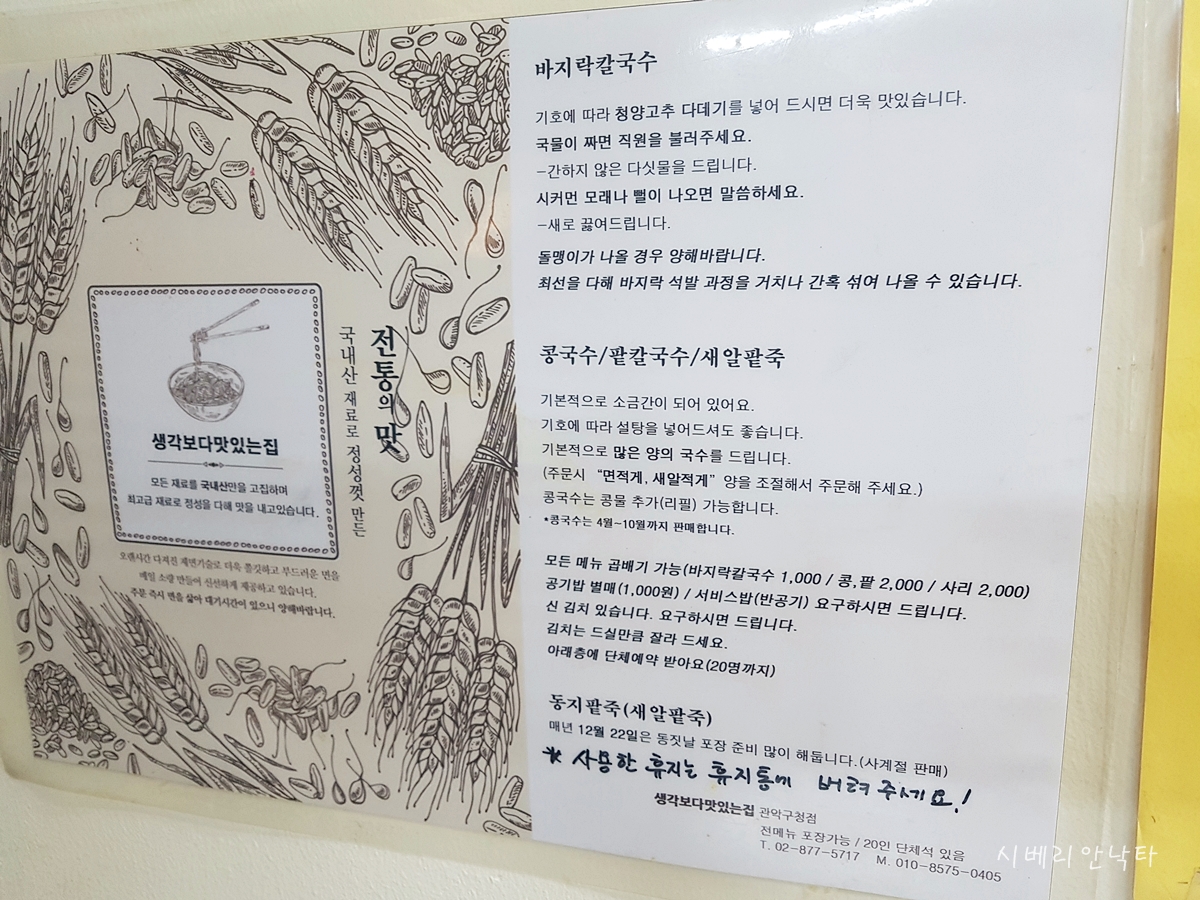 면식이며 칼국수를 아주 좋아하지만, 바지락칼국수와 같은 조개칼국수는 그리 즐기지 않는다. 조개의 시원함이 면의 전분과 섞이면 약화되는 느낌도 들고, 간혹 조개의 비릿함이 올라올때도 있기 때문이다. 그래서 조개칼국수류는 조개찜을 먹고 난 뒤 사리로 먹는것 외에는 잘 먹지 않는데, 관악구에 바지락칼국수를 정말 잘하는 곳이 있다고 지인이 가자고 한다. 이미 지역주민들에게는 유명한 '생각보다맛있는집 관악구청점'이다. 팥칼국수와 바지락칼국수가 시그니처라고 하는데, 두 메뉴다 필자가 좋아하는 메뉴가 아니라 존재를 몰랐나보다.