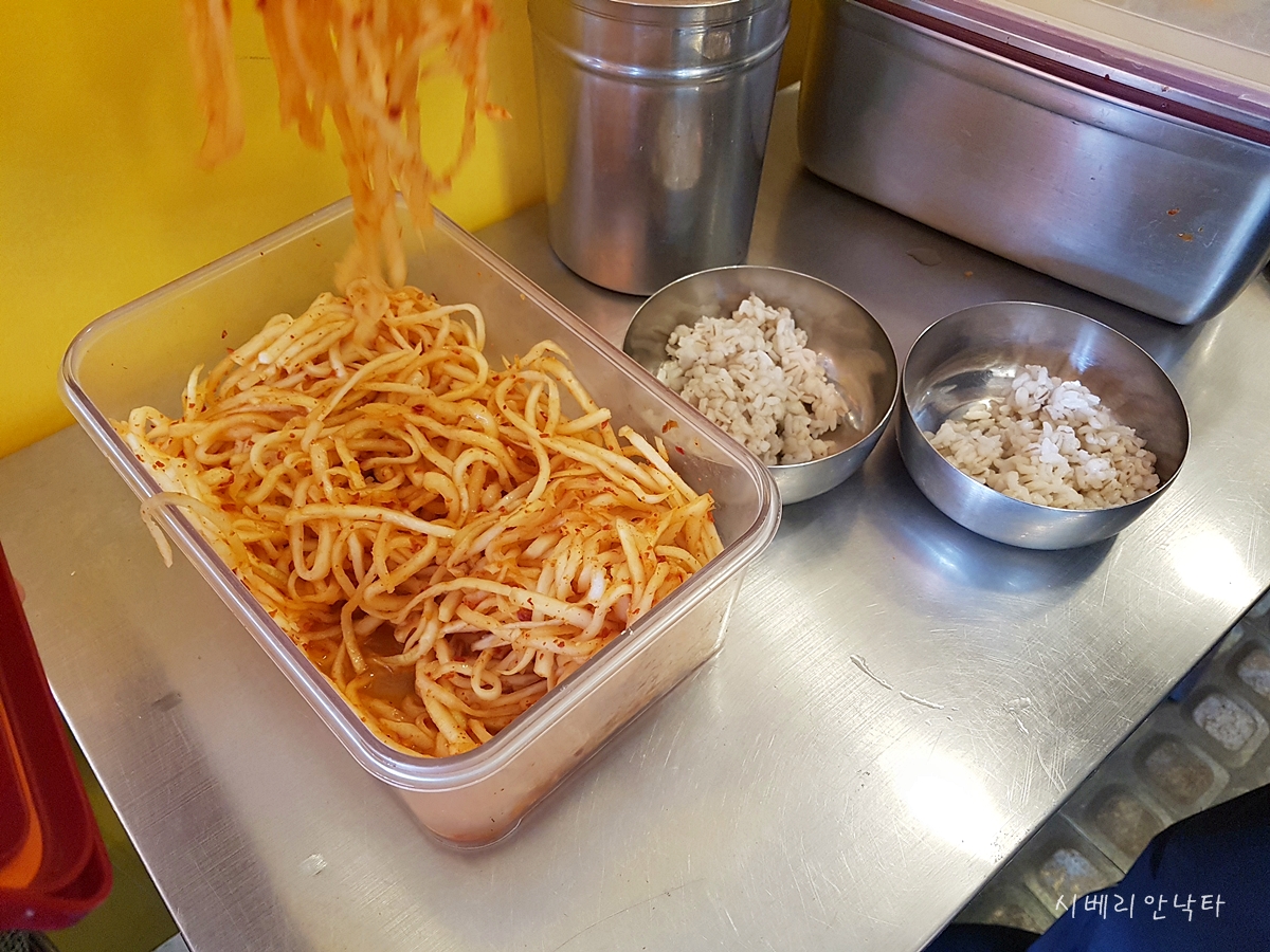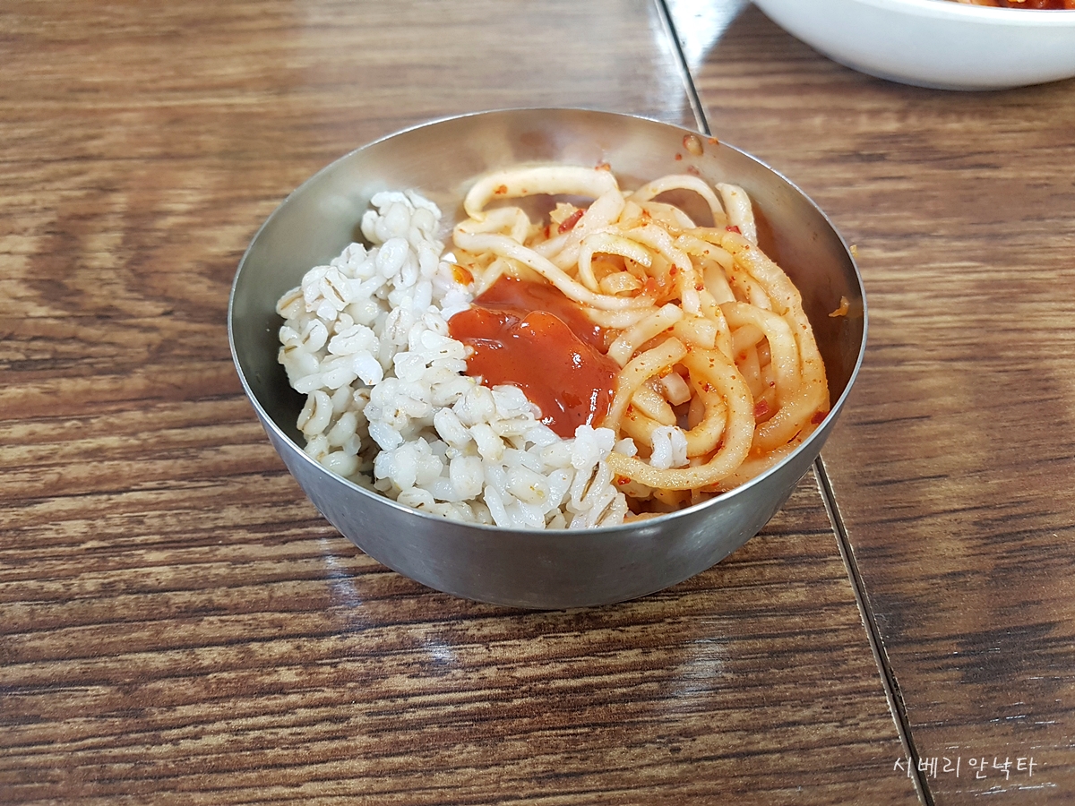 다만 입구쪽 셀프 코너에서 직접 퍼와야 한다. 열무가 아닌 무생채가 있는데, 딱봐도 직접 만드신 걸 알 수 있다.