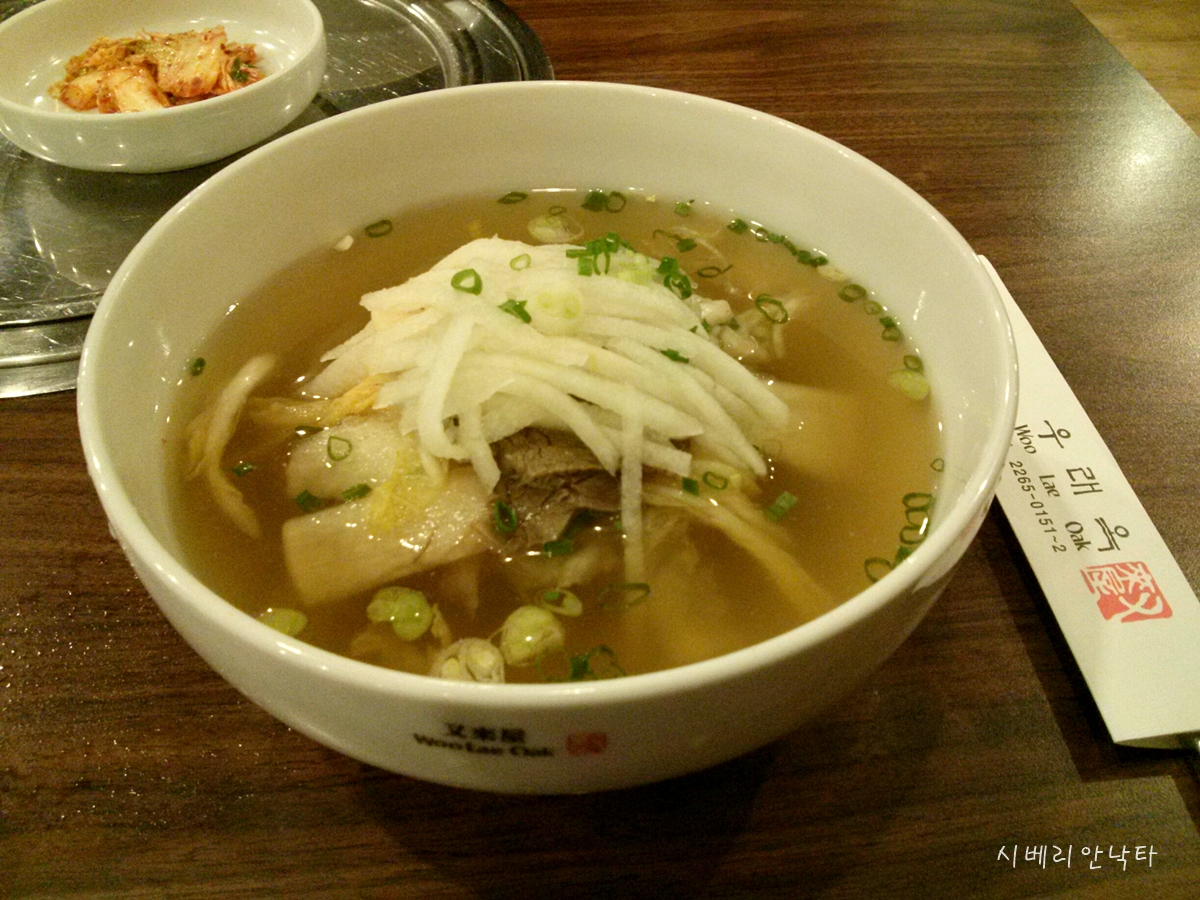 서울의 평냉집을 많이 다닌건 아니지만, 평양냉면집 중에서 국물의 육향은 우래옥이 가장 강하다고 본다. 그도 그럴 것이 원래 평양냉면은 꿩,닭 육수에 동치미를 섞어야 하지만, 우래옥은 오직 소고기로만 국물을 낸다. 한우암소의 양지, 사태, 우둔살로 국물을 내는 것으로 아는데, 그러니 가격이 비싸질 수 밖에 없다. (예전에 평양냉면 조미료 논란이 있었는데, 필자가 알기론, 일제시대 아지노모토 등장 이 후로 냉면집에서 조미료가 빠진적은 없다고 알 고 있다. 물론 정확건 아니니 그냥 썰 정도로만 알고 넘어가자.)