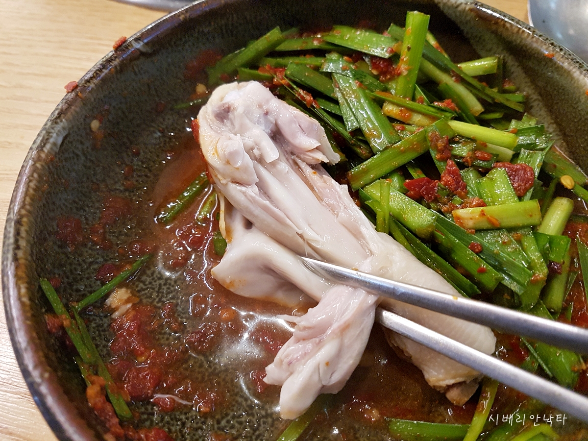 아무튼 닭한마리는 한국사람들 중에도 모르는 사람이 많은 음식인만큼 그 맛을 궁금해 하는 사람이 많은데, 간단하게 표현하면 닭곰탕의 전골화 라고 보면 된다. 닭곰탕처럼 닭의 감칠맛이 있는듯 없는듯 국물에 잔잔하게 녹아있고, 끓일수록 그 감칠맛이 살짝 진해진다. 그렇다고 삼계탕이나 백숙처럼 녹진한 맛은 절대 되지 않는, 라이트한 국물이라 술을 술술 부른다. 직접 만든 소스에 닭을 찍어먹다가, 마지막에 칼국수 사리를 넣으면 완벽한 반주용으로 손색이 없다.