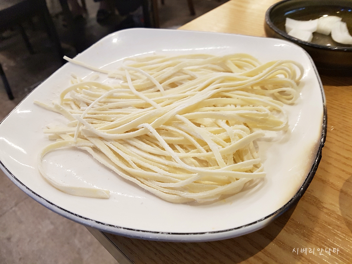 메뉴판에 적혀있는 맛있게 먹는법을 따라서 이번에 칼국수면도 소스에 넣어 먹어본다.