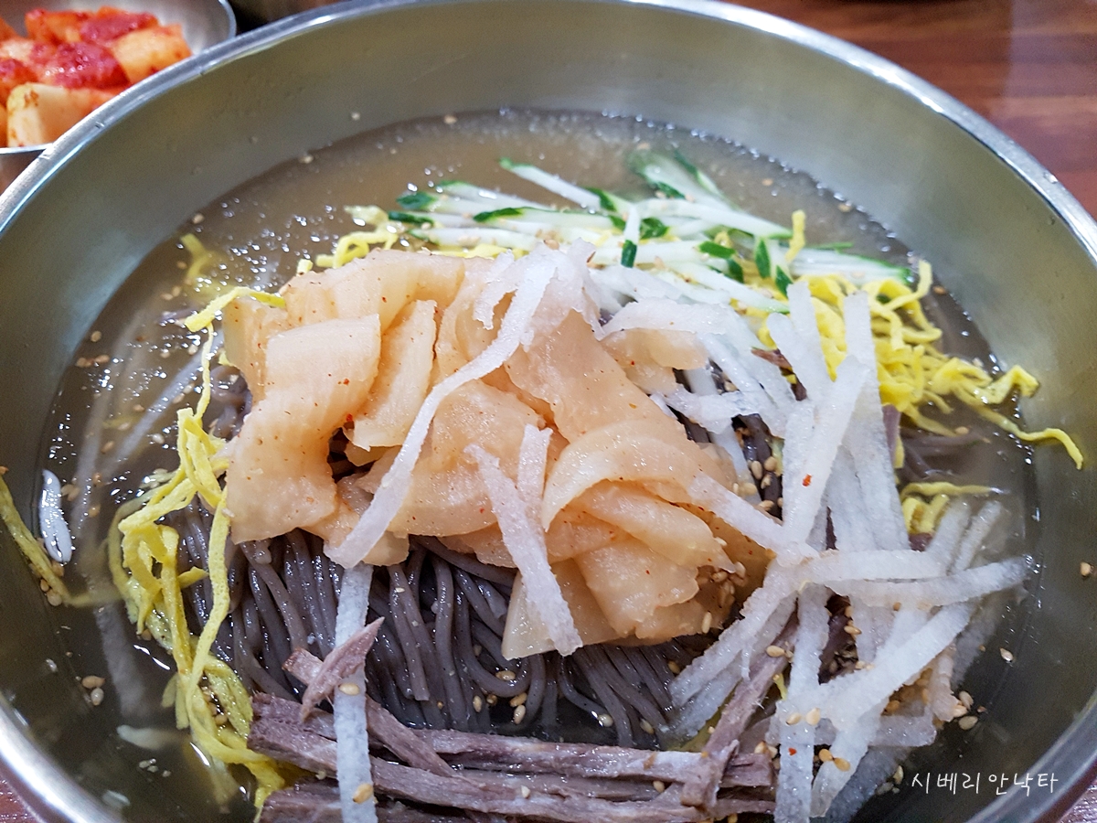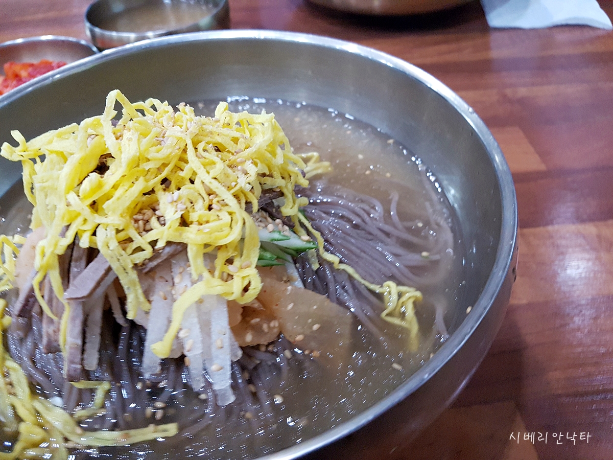 고명은 정말 푸짐, 다양하다. 서두에 언급한 음양오행설을 따라 5개의 색이 다른 고명을 일부러 맞춘 건진 모르겠지만, 5가지 고명이 올라가 있다. 계란지단, 소고기, 냉면무, 배채, 오이채의 색감이 참 이쁘다.