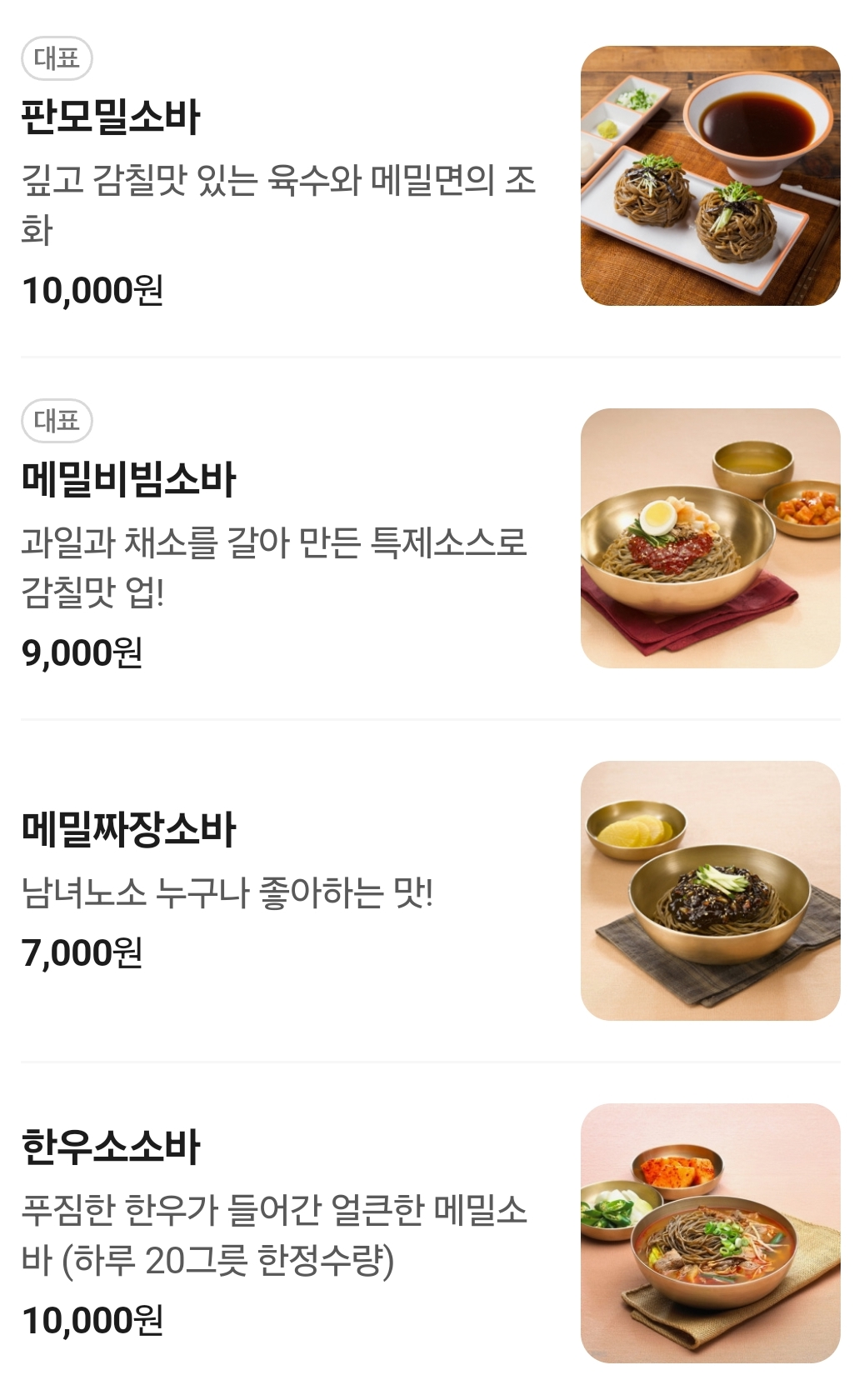 판모밀소바 : 1만원 / 들기름소바 : 1.1만원 / 회비빔소바 : 1.2만원 / 짜장소바 : 7000원