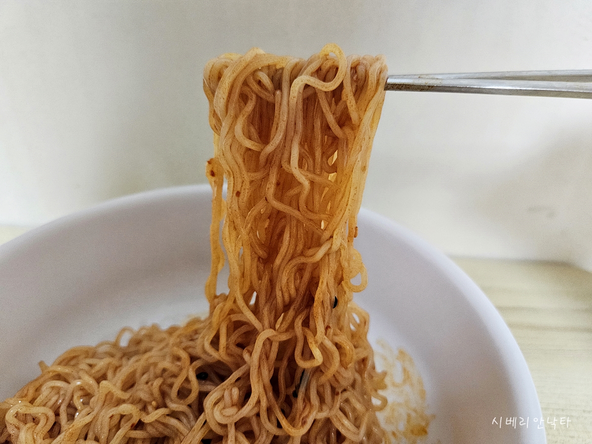 확실히 팔도비빔면보다는 얇은데, 탄성을 오히려 쫌 더 있는 느낌이다.