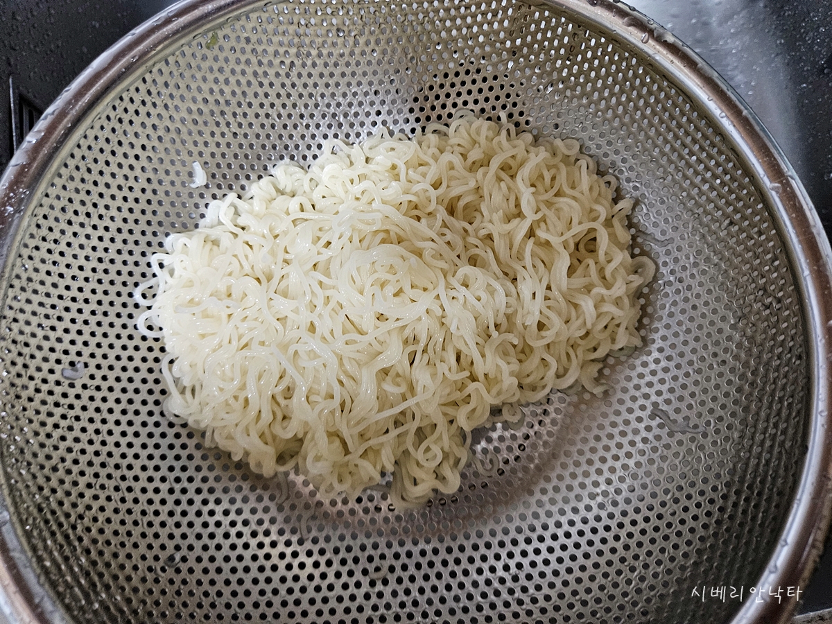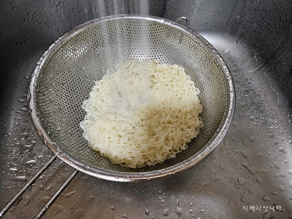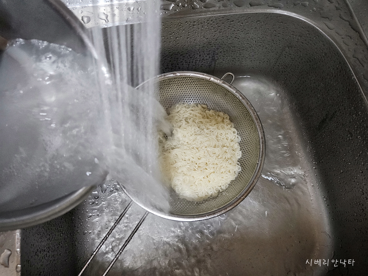 흐르는 물에 열심히 면을 헹군 뒤, 물기를 확실히 제거해준다.