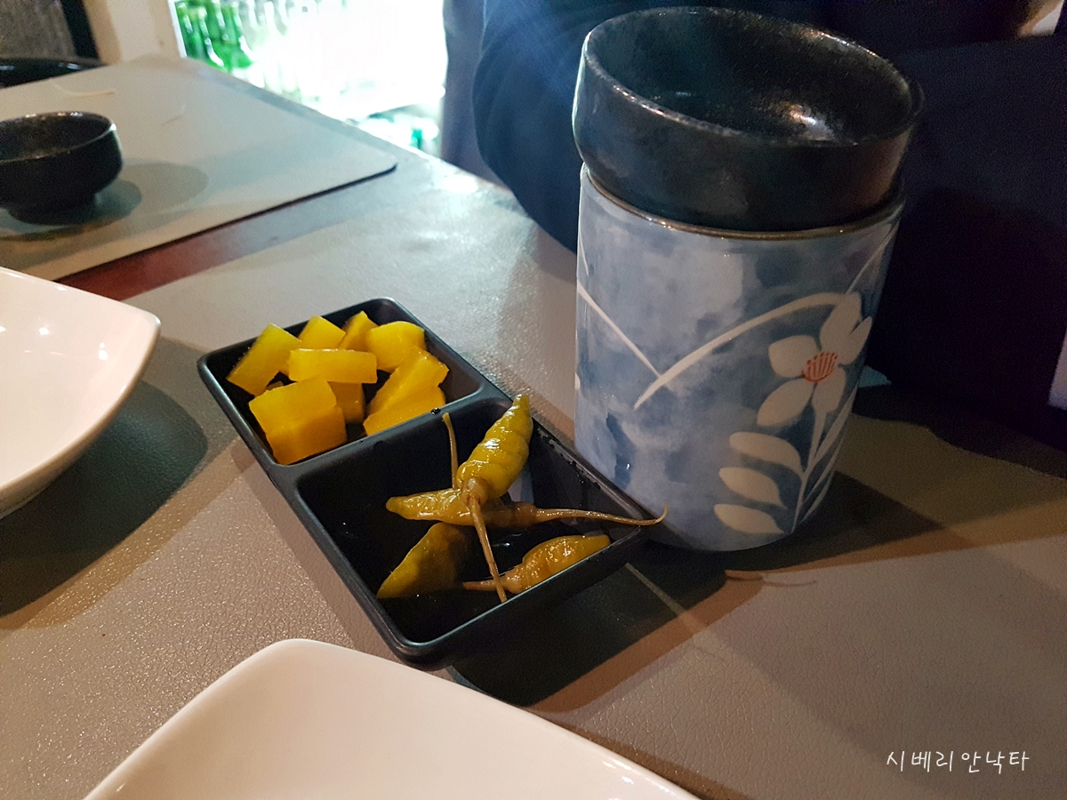 그리고 기본안주는 공산품스러운 단무지와 산고추장아찌다.