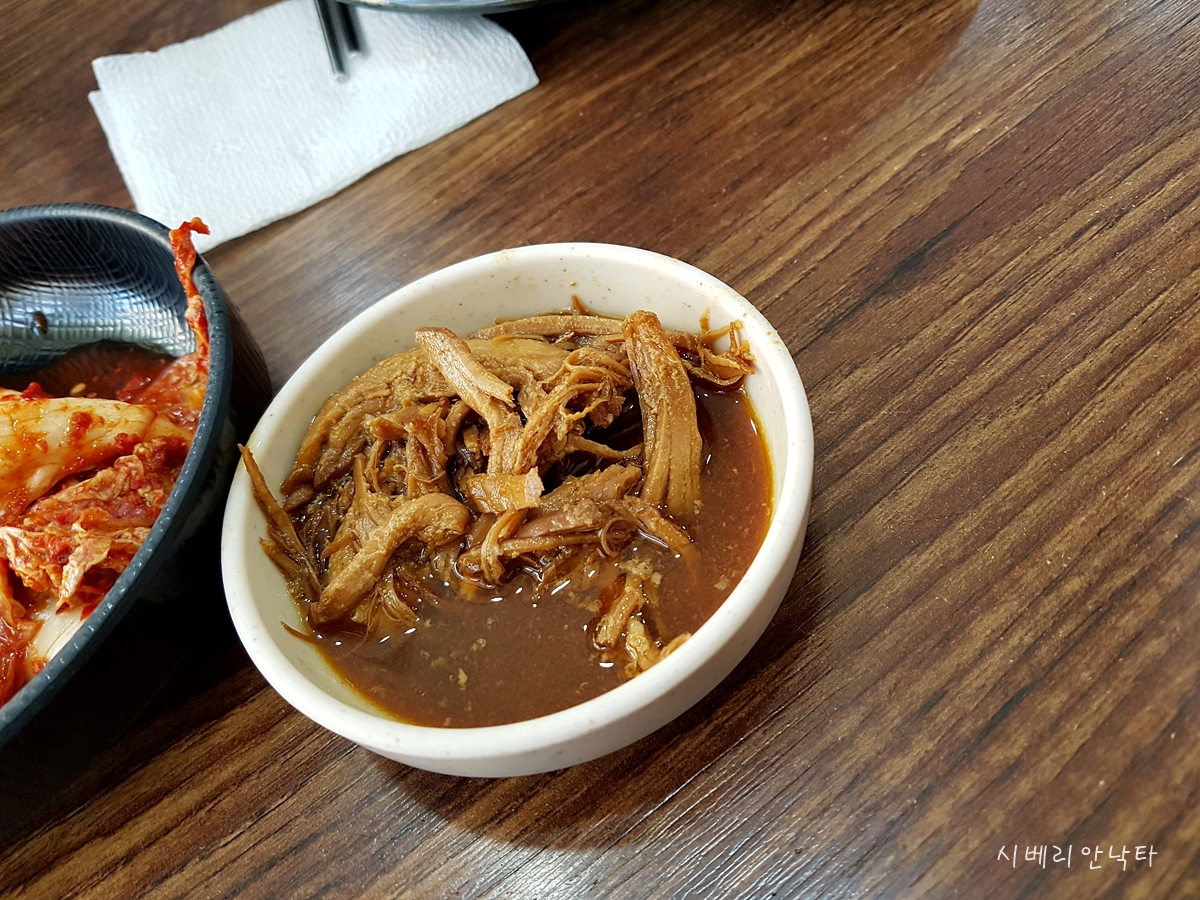 메뉴판에 쓰여있듯이, 김치는 국내산이다. 식당 입구 쪽 테이블에서 이모님이 열심히 반찬을 담고 계신 걸 봤을 때, 김치는 직접 담근듯하다. 맛도 깊이감 전혀 없는 중국산의 그런 맛이 아니다. 배추김치는 겉절이에 가깝고, 깍두기나 김치나 익힘은 거의 없다. 서울식 김치로 젓갈맛도 없고, 손님 연령층이 중년이라 그런지 단맛도 아주 적다.