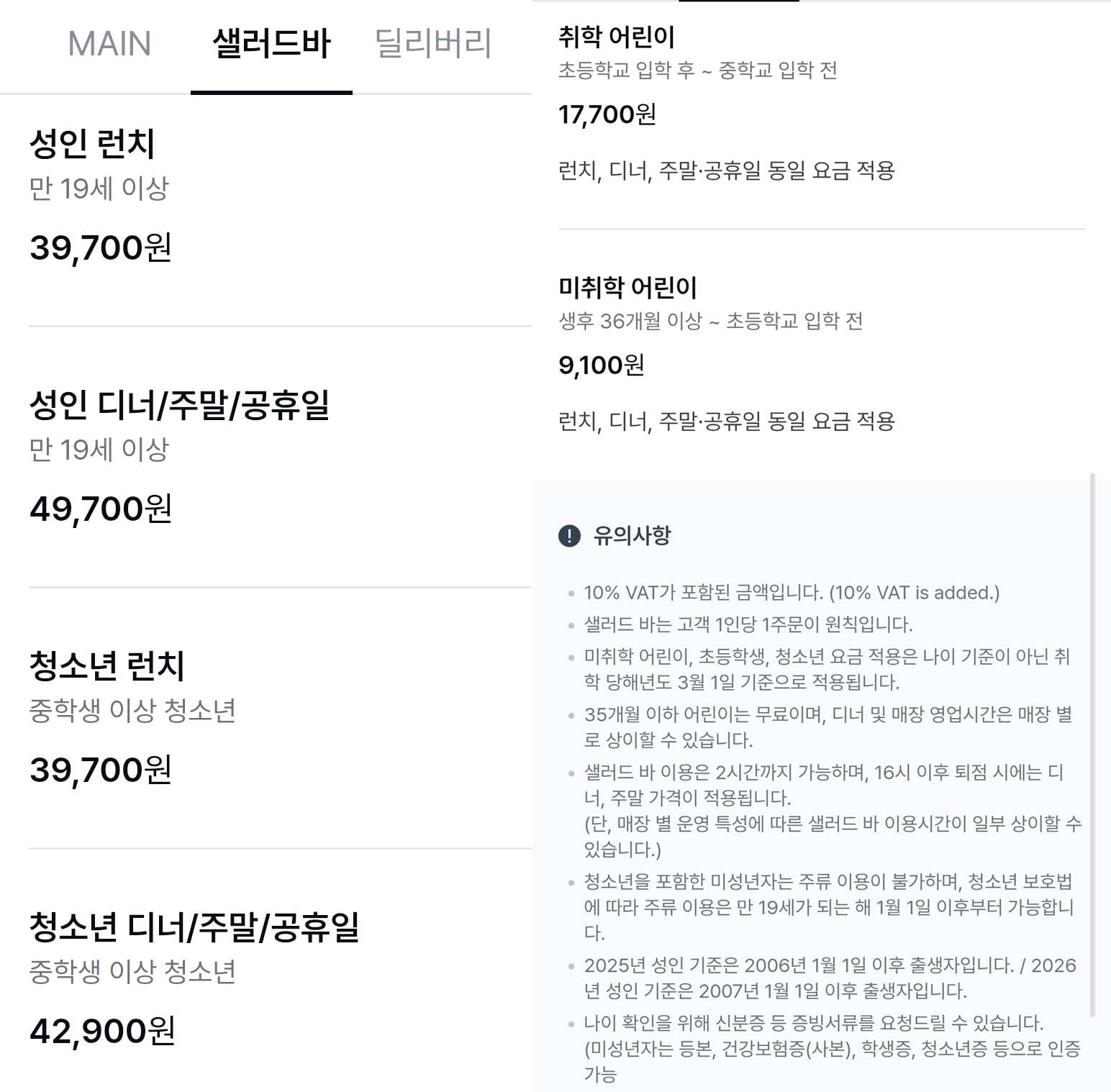 샐러드바 저녁/주말/공휴일 (청소년) : 42,900원