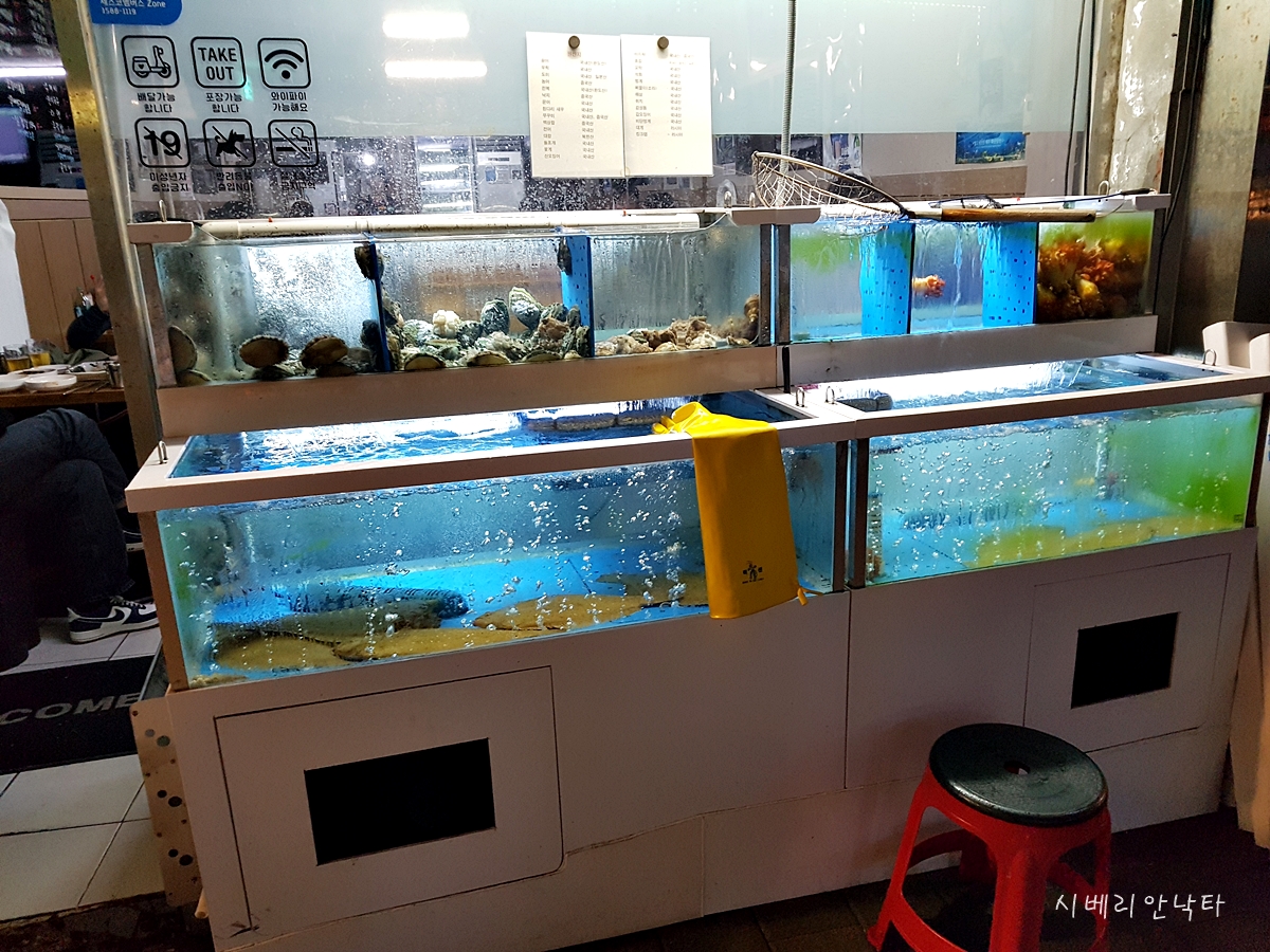 입구에 수조관이 있는게, 횟집스럽기도하다.