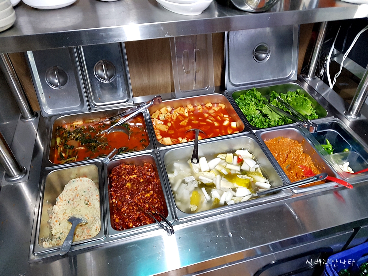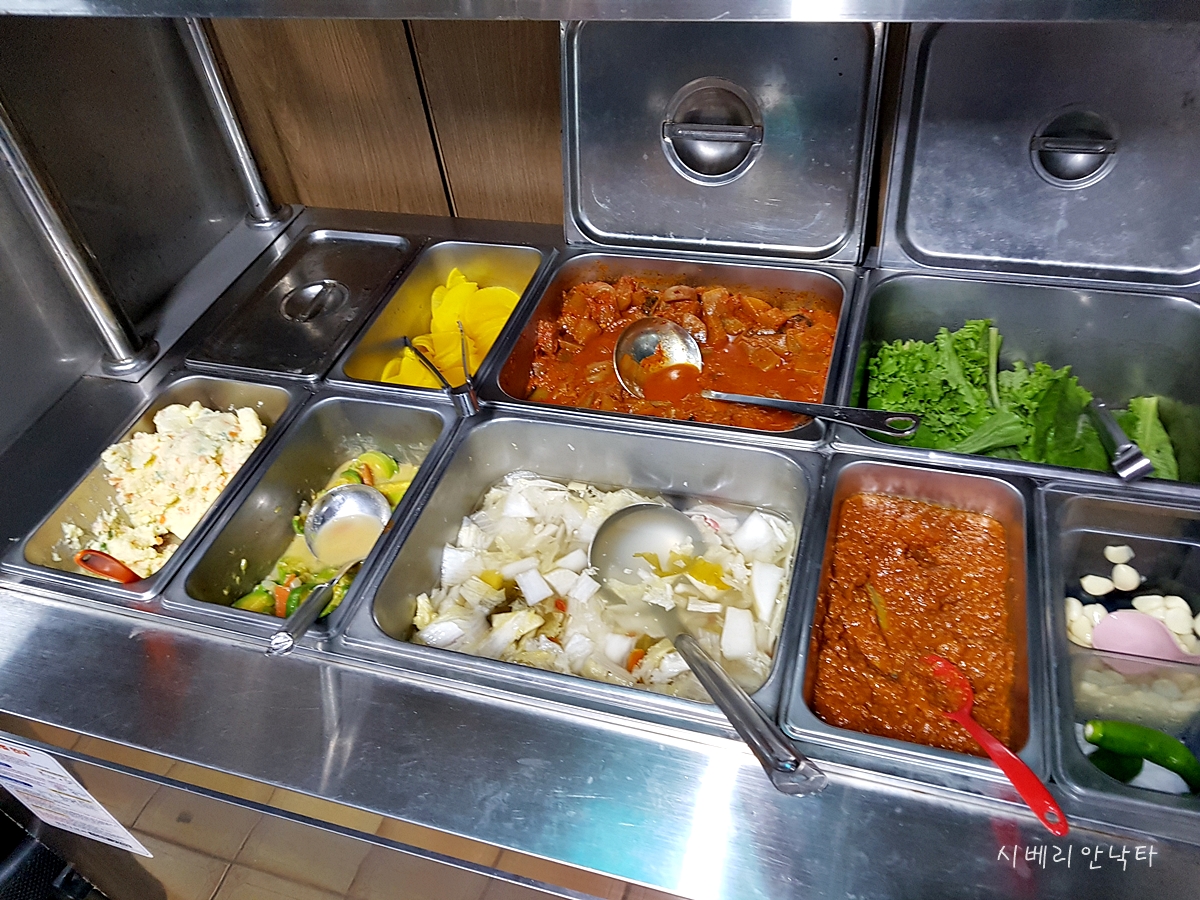 주로 샐러드와 김치, 젓갈이 있는데, 반찬은 셀프바에서 직접 퍼와야한다.