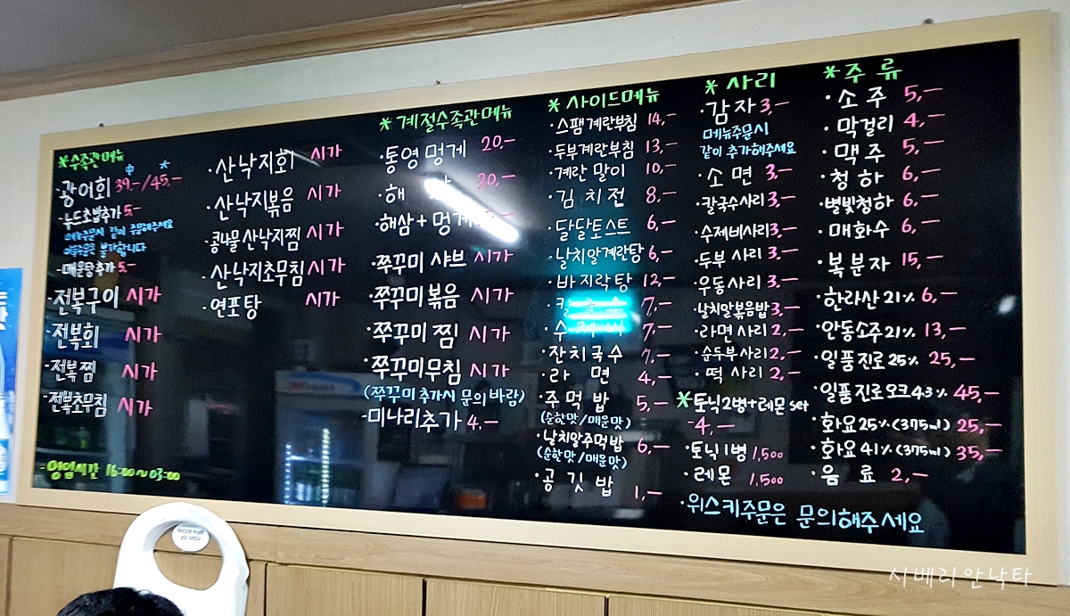 그리고 우측 메뉴판은 해산물이나 계절메뉴판으로 변동 메뉴다.